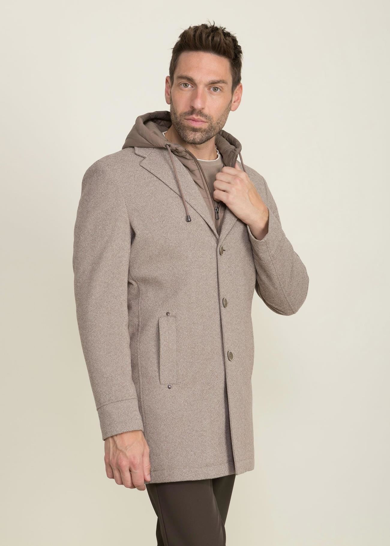 Abrigo de paño beige con estampado de espiga, confeccionado en lino y poliéster. Diseño moderno con capucha interior acolchada y cierre de botones. Elegante, cálido y versátil.