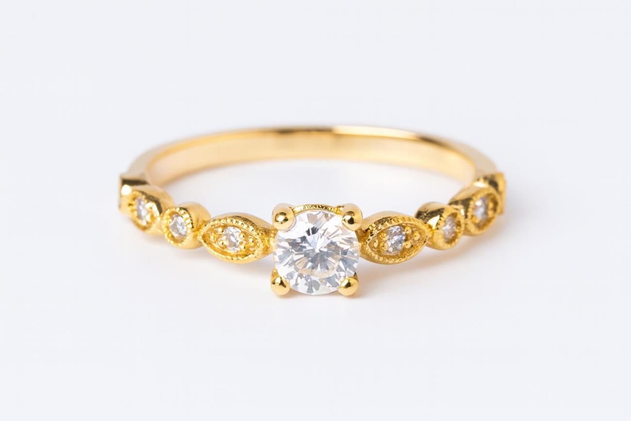 Anillo de oro amarillo 18kt con circonitas blancas en diseño clásico y elegante.