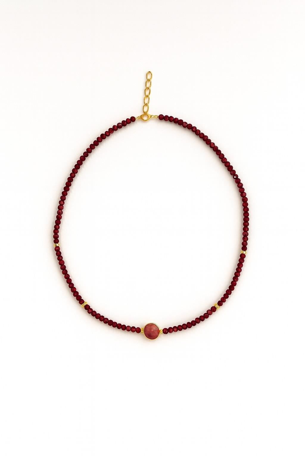 Este collar está elaborado con cuentas de jaspe granate teñido, seleccionadas por su intenso color rojizo y su brillo uniforme. Su tonalidad profunda aporta un carácter elegante y distintivo a la pieza. En el centro destaca una rodonita en cabujón con engaste dorado, que añade un contraste armonioso y un punto focal sofisticado. Pequeños detalles metálicos en tono dorado complementan el diseño, realzando la calidez del conjunto. Incluye cierre con cadenilla ajustable para adaptarse a diferentes longitudes, convirtiéndolo en un accesorio ideal tanto para uso diario como para ocasiones especiales.