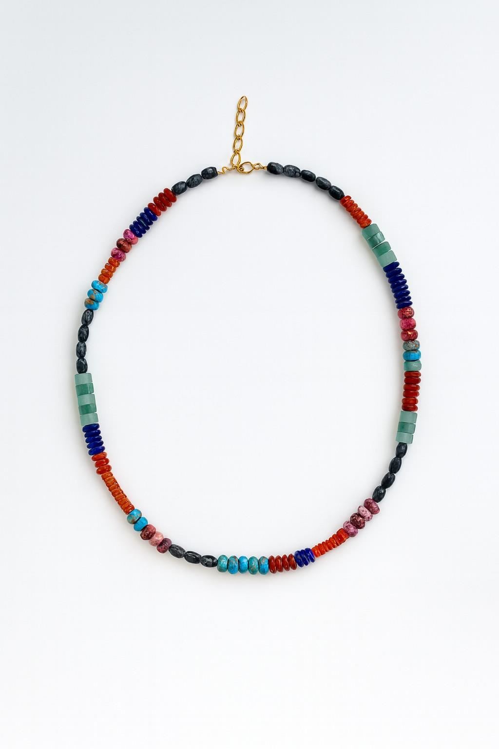 Collar artesanal elaborado con piedras naturales multicolor, combinadas en un diseño equilibrado y rematado con cierre dorado ajustable.