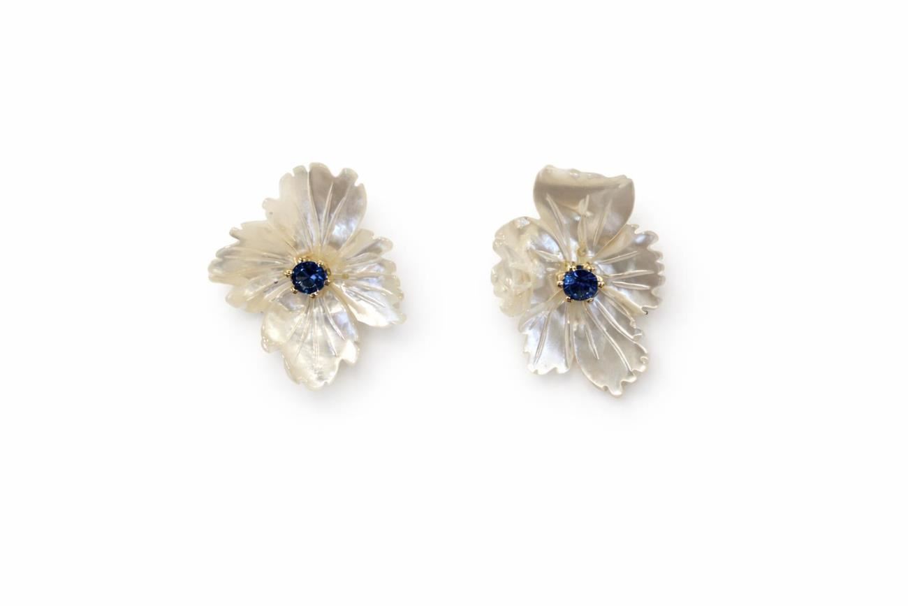 Pendientes oro amarillo 18kt flor de nácar con circonita azul