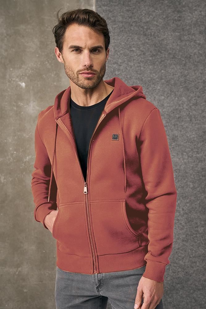 Sudadera Darío Beltrán con capucha en color terracota, confeccionada en algodón y poliéster. Corte regular fit y cierre de cremallera.