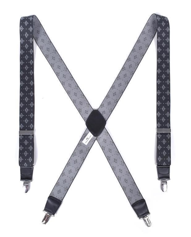 Tirantes elásticos grises con elegante estampado de rombos, detalles en piel y clips metálicos resistentes.