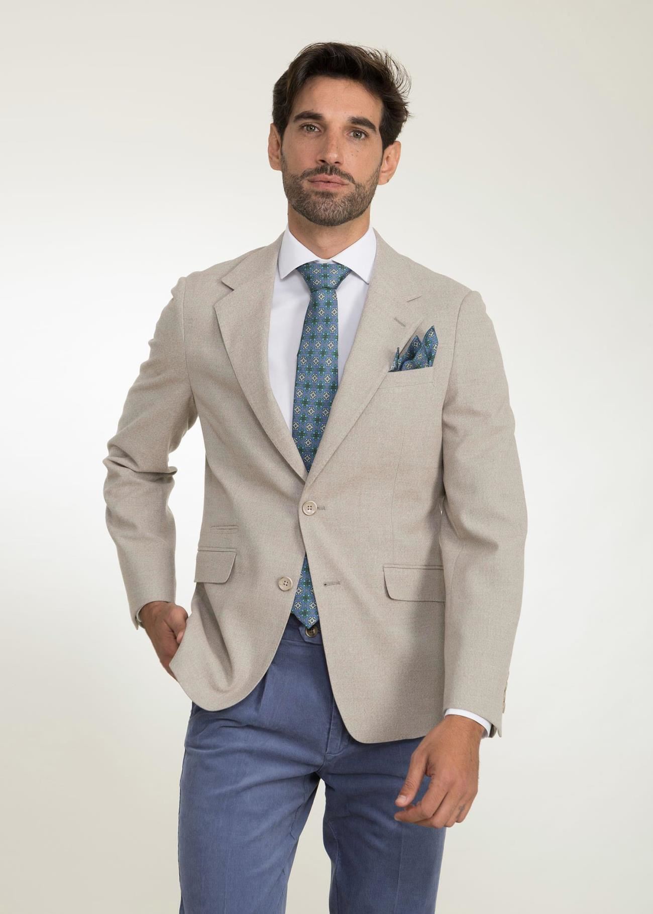Americana regular fit afranelada beige con solapa sencilla y bolsillos inclinados