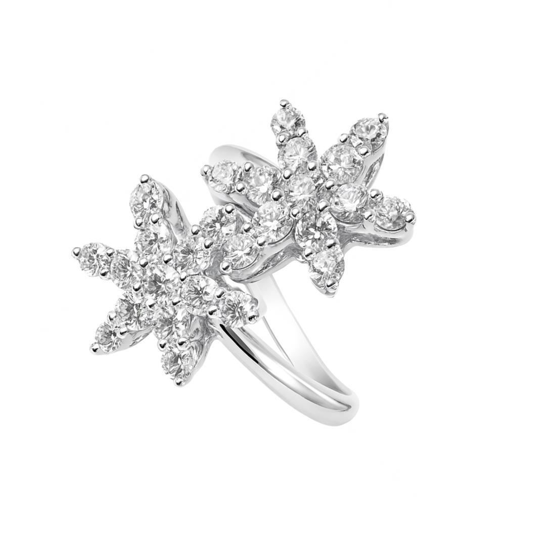 Este sofisticado anillo en oro blanco de alta pureza presenta un diseño único de doble flor, compuesto por deslumbrantes diamantes cuidadosamente engastados. Cada pétalo resplandece con el brillo intenso de las piedras, creando un efecto radiante y elegante que realza la feminidad y el estilo.