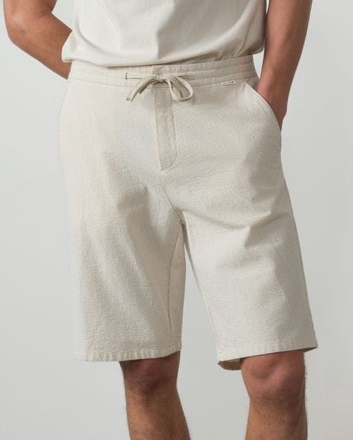 Bermuda con goma y cordón en cintura en rayas seersucker beige