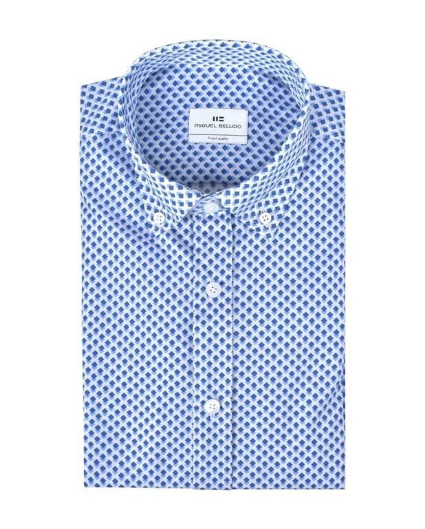 Camisa sport slim fit con microestampado geométrico en azul. Moderna, fresca y versátil, ideal para looks casuales con personalidad.