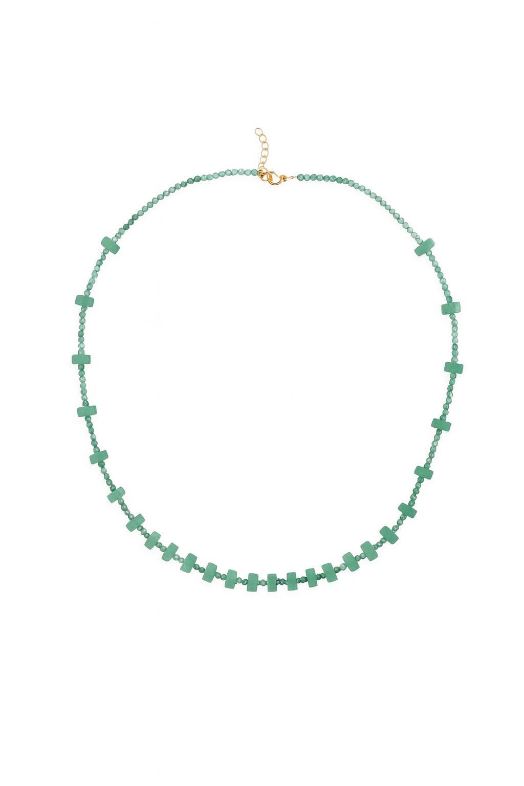 Collar de aventurinas en tono turquesa con detalles en acero bañado en oro, diseño moderno y longitud de 45 cm.