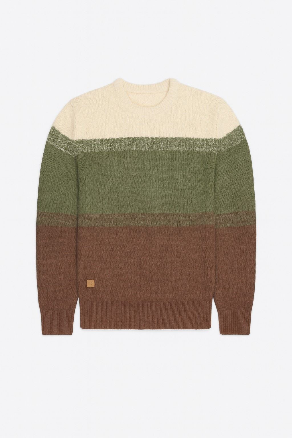 Jersey tricolor de cuello redondo en mezcla de lana, alpaca y mohair con corte regular fit y diseño de rayas en tonos beige, verde y marrón.