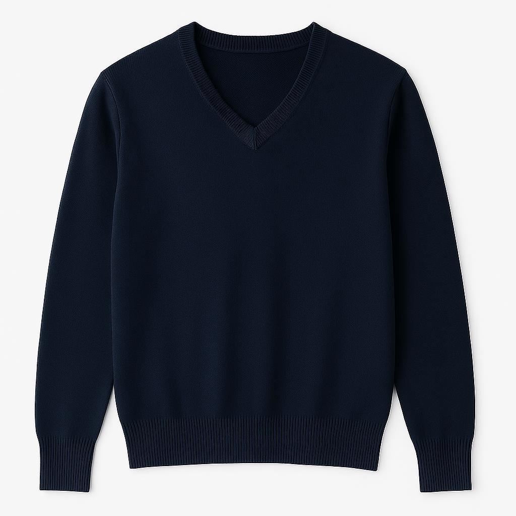 Jersey de punto en algodón con cuello en V de Darío Beltrán, en color azul marino, cómodo, versátil y elegante.