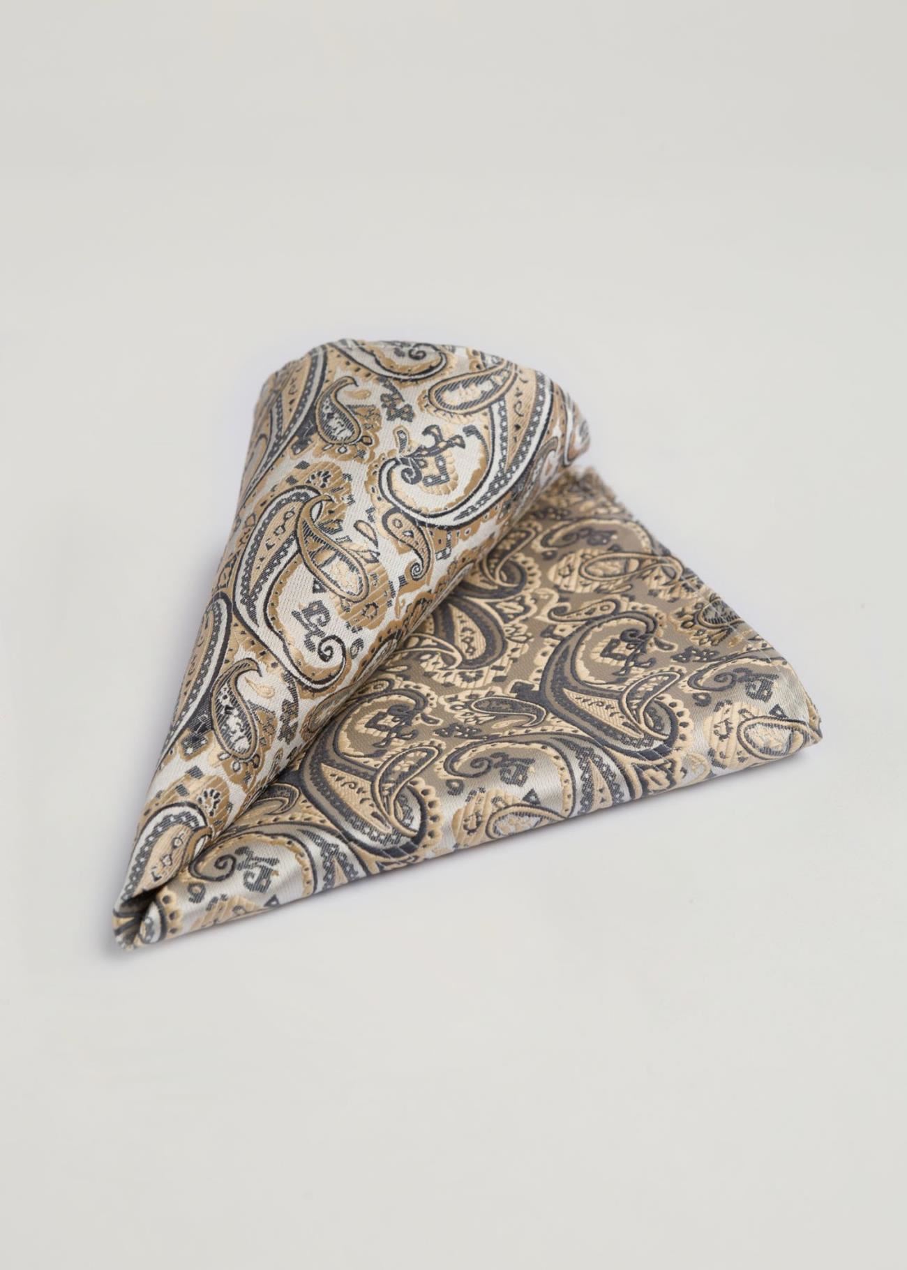 Pañuelo de bolsillo Lino Clemente con estampado paisley en tonos dorado y gris. Elegancia y sofisticación en un accesorio imprescindible.