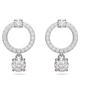 Este par de pendientes de Swarovski es sencillo pero brillante. Una piedra redonda de color blanco cuelga de un aro pequeño que está bellamente adornado con brillante pavé. Los elementos colgantes se mueven cada vez que giras la cabeza, reflejando la luz de forma cambiante y brillante.