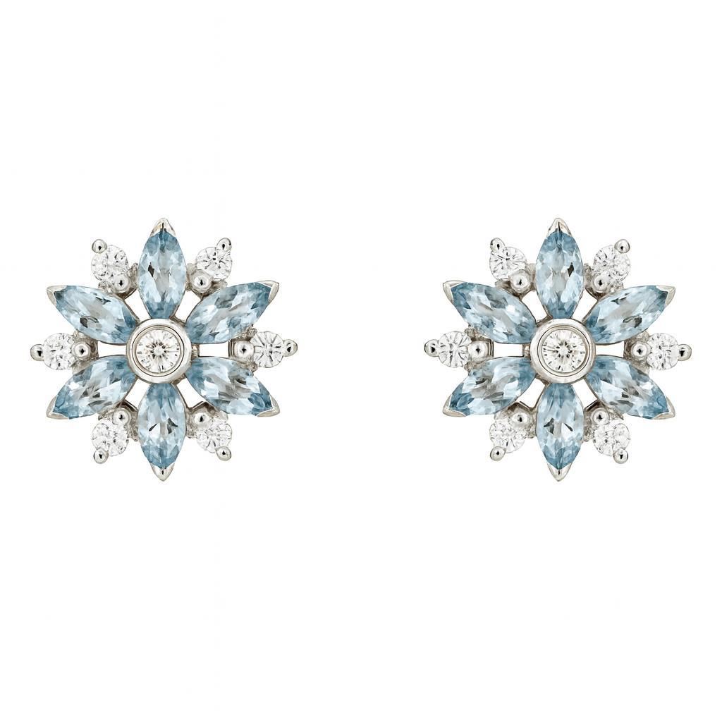 Pendientes rosetón de oro blanco 14 brillantes 0,23 CT y 12 aguamarinas 0,84CT