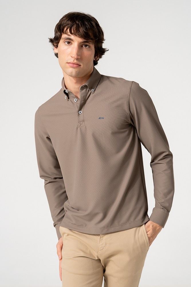 Polo de manga larga para hombre con microestructura en color visón, diseñado por Darío Beltrán. Su tejido técnico combina poliamida y elastano para ofrecer ligereza, elasticidad y confort en el día a día. Presenta cuello abotonado, ajuste regular fit y un acabado sofisticado ideal para looks casuales y elegantes. Una prenda versátil que se adapta a diferentes estilos y temporadas, manteniendo siempre una imagen cuidada y actual.