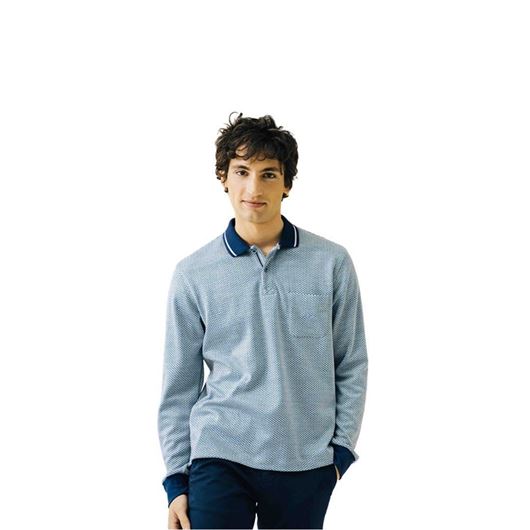 Polo de hombre de manga larga en tejido elástico con microestructura y cuello abotonado. Diseño elegante y cómodo de Darío Beltrán.