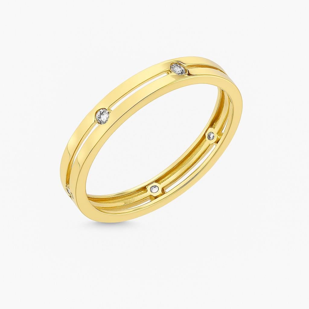 Anillo de oro amarillo 18 kt con diamantes y diseño abierto de doble línea. Elegante, moderno y luminoso.
