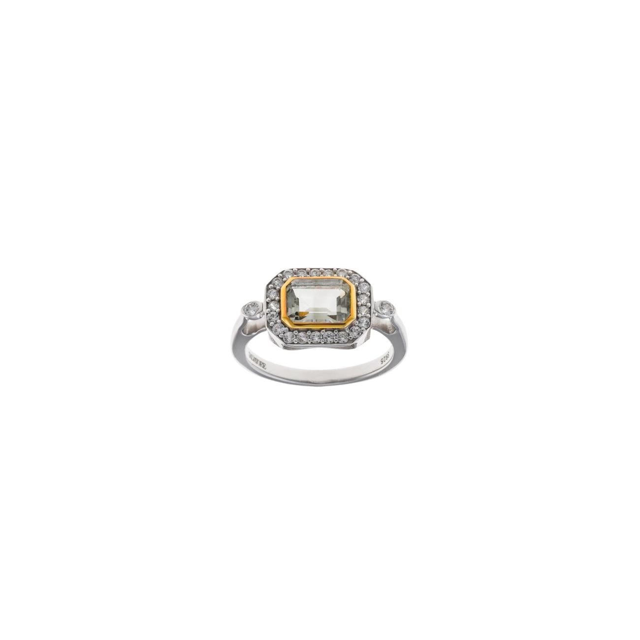 Sortija plata rodio amatista verde rectangulo chapado dorado alrededor circonitas blancas brillantes