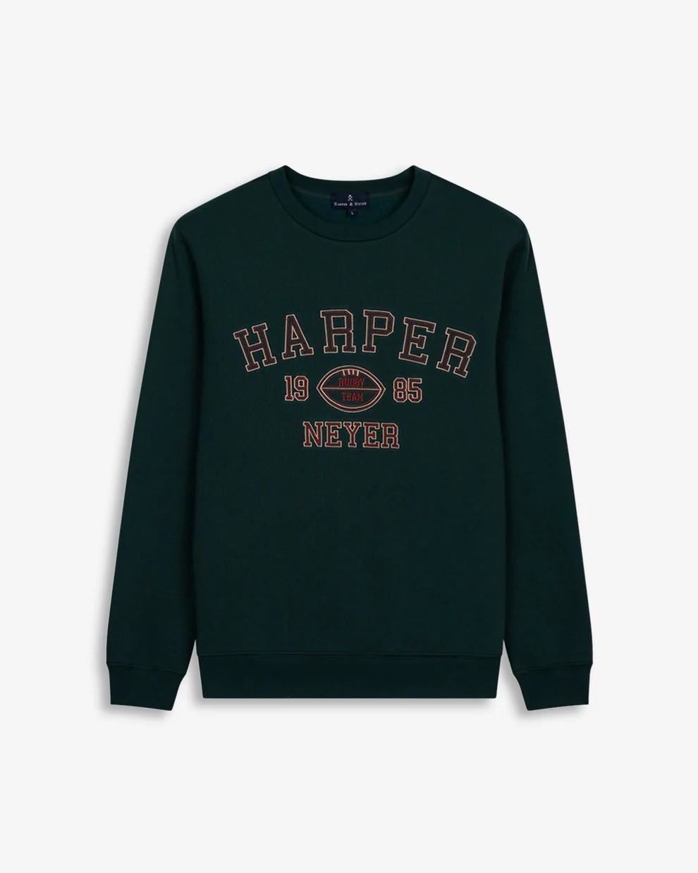 Sudadera en color verde botella con estampado estilo rugby. Cálida, cómoda y moderna, ideal para looks casuales y deportivos.